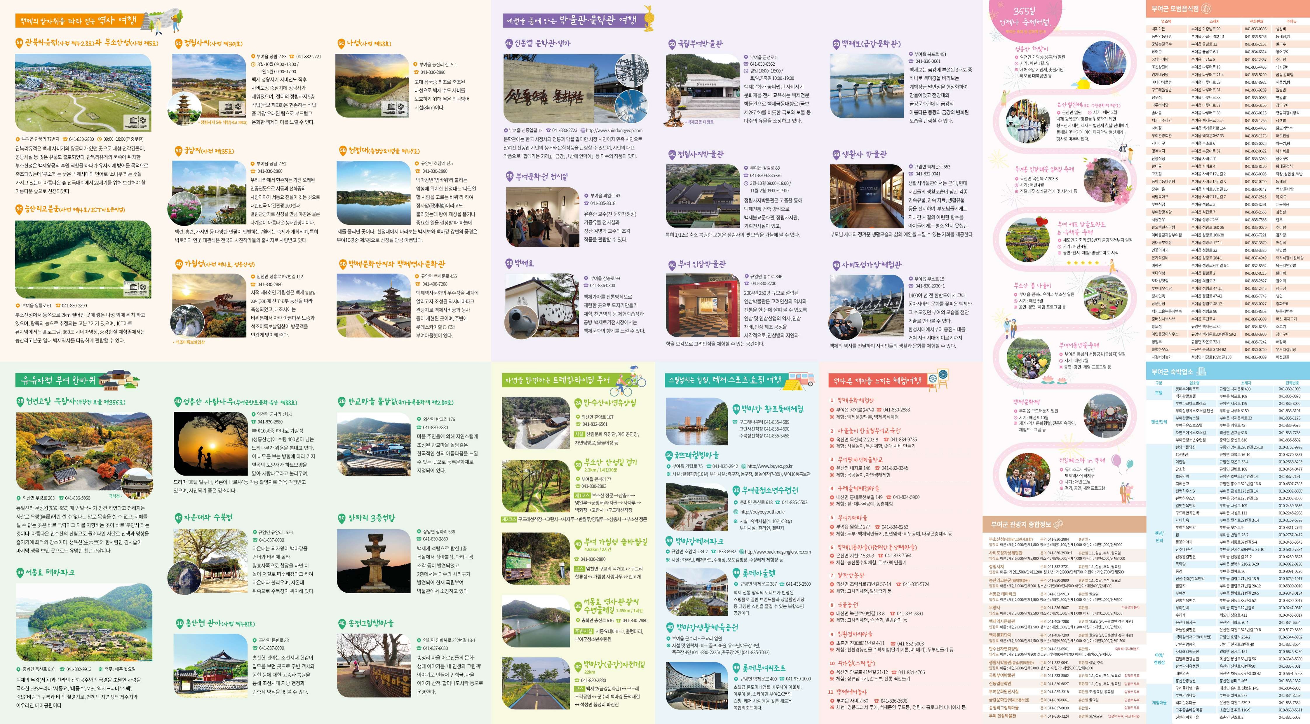 부여의 백제역사 유적지구와 관광명소들을 가상체험하며, 여행 계획은 제공하는 부여 관광지도와 홍보물로 완성해 보세요. 백제의 아름다움을 담은 리플릿과 함께 관광지 운영시간과 이용요금도 체크하면서 완벽한 여행 코스를 잡아 보시기 바랍니다.