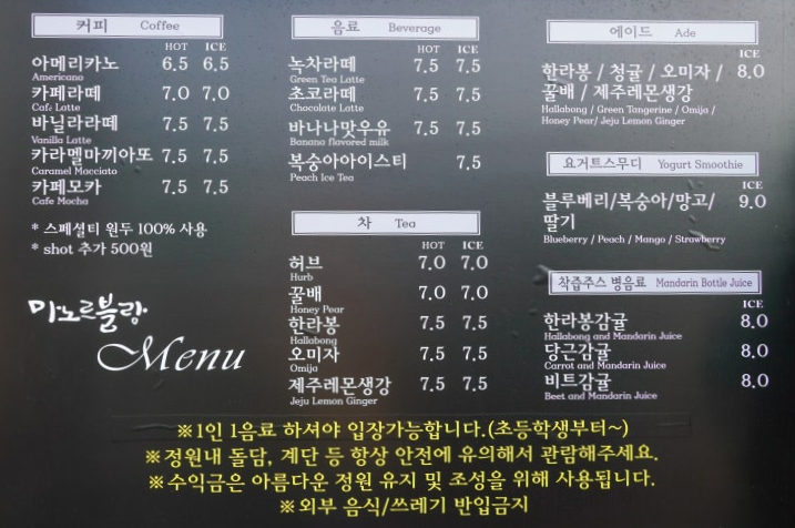 - 입장료 : 유료(초등학생부터 1인 1음료 주문 or 입장료)