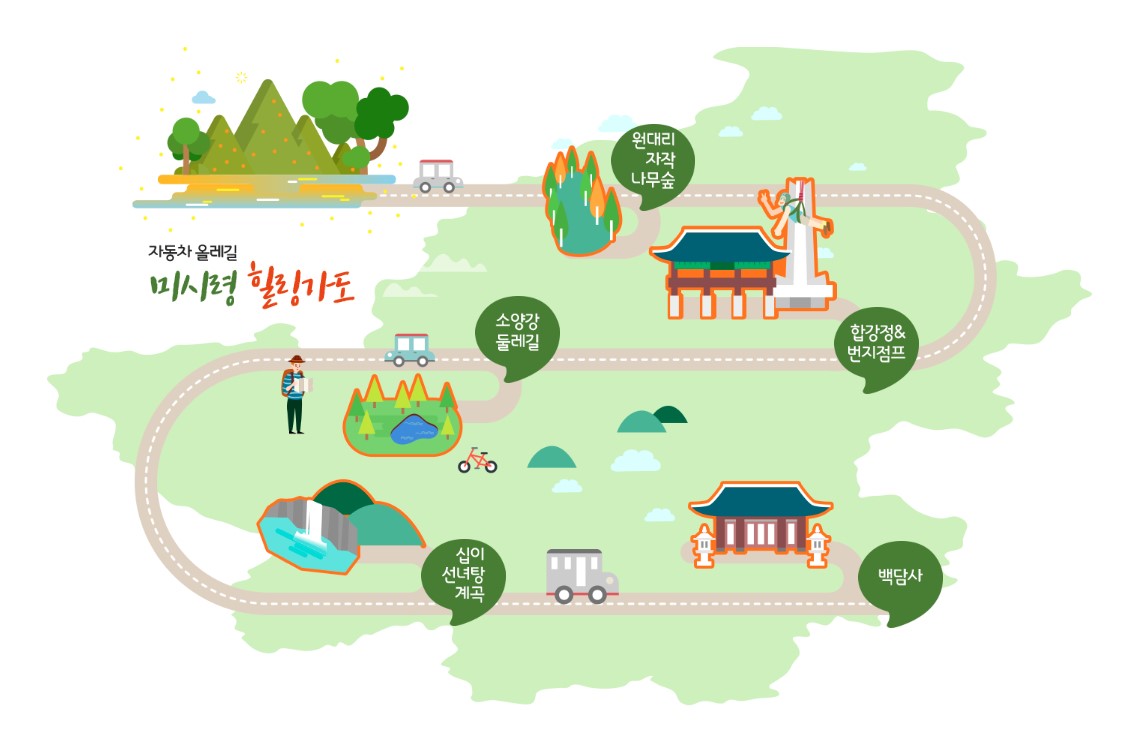 인제군에서 운영하는 사이트(https://tour.inje.go.kr/)를 통해서 다양한 여행코스를 안내받을 수 있습니다. 저는 미시령 힐링가도와 아이들과 함께 즐길 수 있는 감성 가득 가족코스가 좋아 보였습니다.