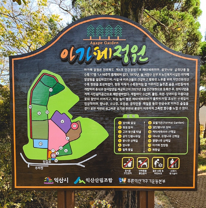 전라북도 민간정원으로 지정되어 있는 아가페정원은 여름이면 더욱 싱그러운 모습을 보여주는 메타세쿼이아, 섬잣나무, 공작단풍 등 수목 17종 1,416주기 등재되어 있는 아담한 정원입니다.