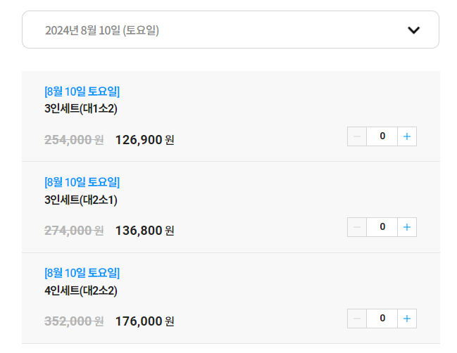 워터파크의 경우 가족 단위로 방문하기 때문에 3~4인 가족이라면 패밀리 이용권을 구매하는 것이 가장 저렴하고 좋습니다. 패밀리 가격으로 2024년 8월 10일 토요일 입장료를 알아보니 3인의 경우 126,900원 4인은 176,000원으로 입장이 가능합니다. 만일 4인 가족인데 딸은 초등학생이고, 아들은 중학생이라면 패밀리 이용권과 학생 할인 조합으로 가시면 됩니다.