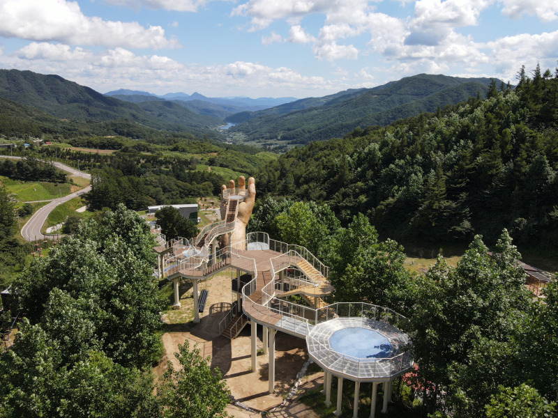 산림레포츠파크의 대표적인 명소는 바로 손 모양 트리탑 '라이트 핸드' 전망대입니다. 이 전망대는 백두대간의 정기를 손안에 담는다는 의미로 설계되었으며, 탁 트인 자연경관을 한눈에 감상할 수 있는 장소로 SNS에서 '인생샷' 명소입니다. 이미 유명해진 거창 감악산 별바람언덕에 이어 제2의 사진 명소로 주목받고 있습니다.