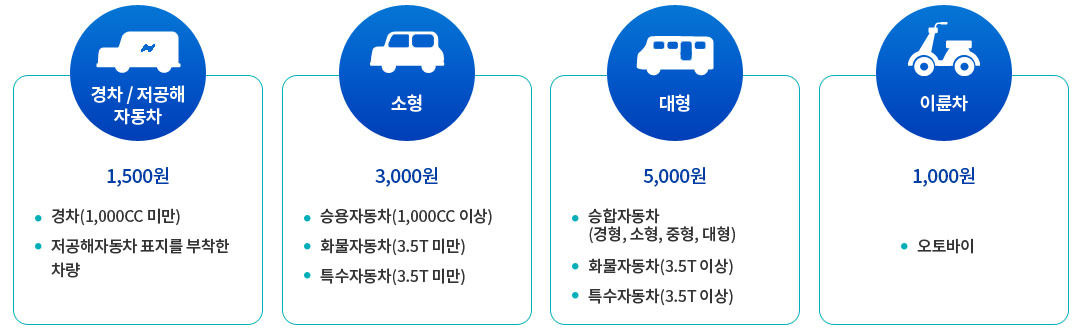 | 대형 | 5,000원 | 승합자동차(경형, 소형, 중형, 대형), 화물자동차(3.5톤 이상), 특수자동차(3.5톤 이상) |