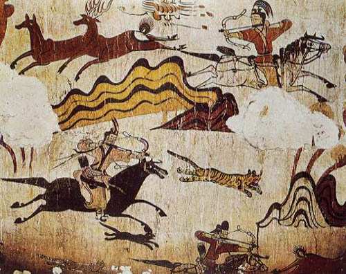 수렵도 그림을 자세히 보시면 화살촉이 뾰족하지 않다는 것을, 그리고 선명한 등자가 보입니다. 또한 달리는 말에서 뒤를 돌아보고 활을 쏘는 모습을 통해 당시 고구려가 기병으로써 얼마나 훈련이 잘 되었는지 알 수 있는 장면입니다.