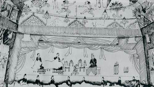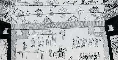 무덤 안쪽 벽에는 두 채의 기와집과 음식상을 들고 나르는 여인들의 모습이 그려져 있습니다.