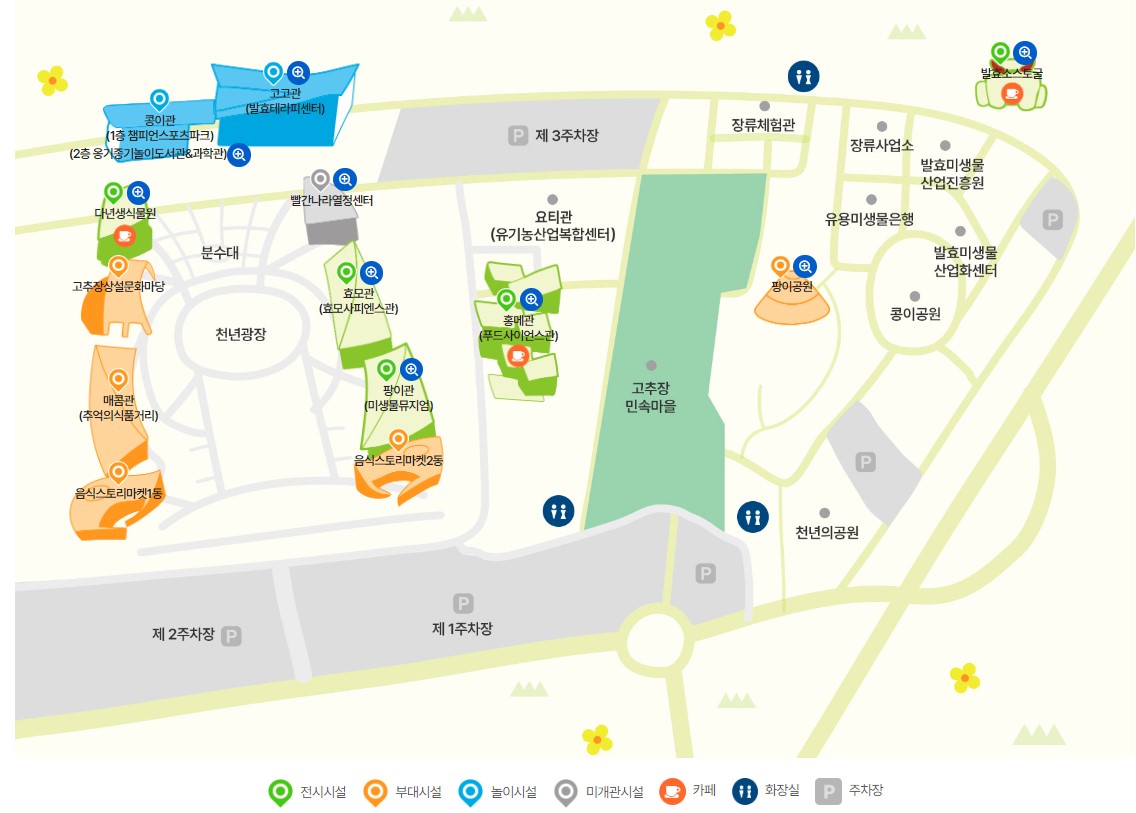 발효테마파크이기 때문에 발효, 미생물, 효모를 주제로 한 놀이·전시·체험·교육 공간들이 마련되어 있으며, 야외무대와 카페 그리고 기념품샵 등의 편의시설을 갖추고 있어 체험활동하기에 좋은 곳입니다.