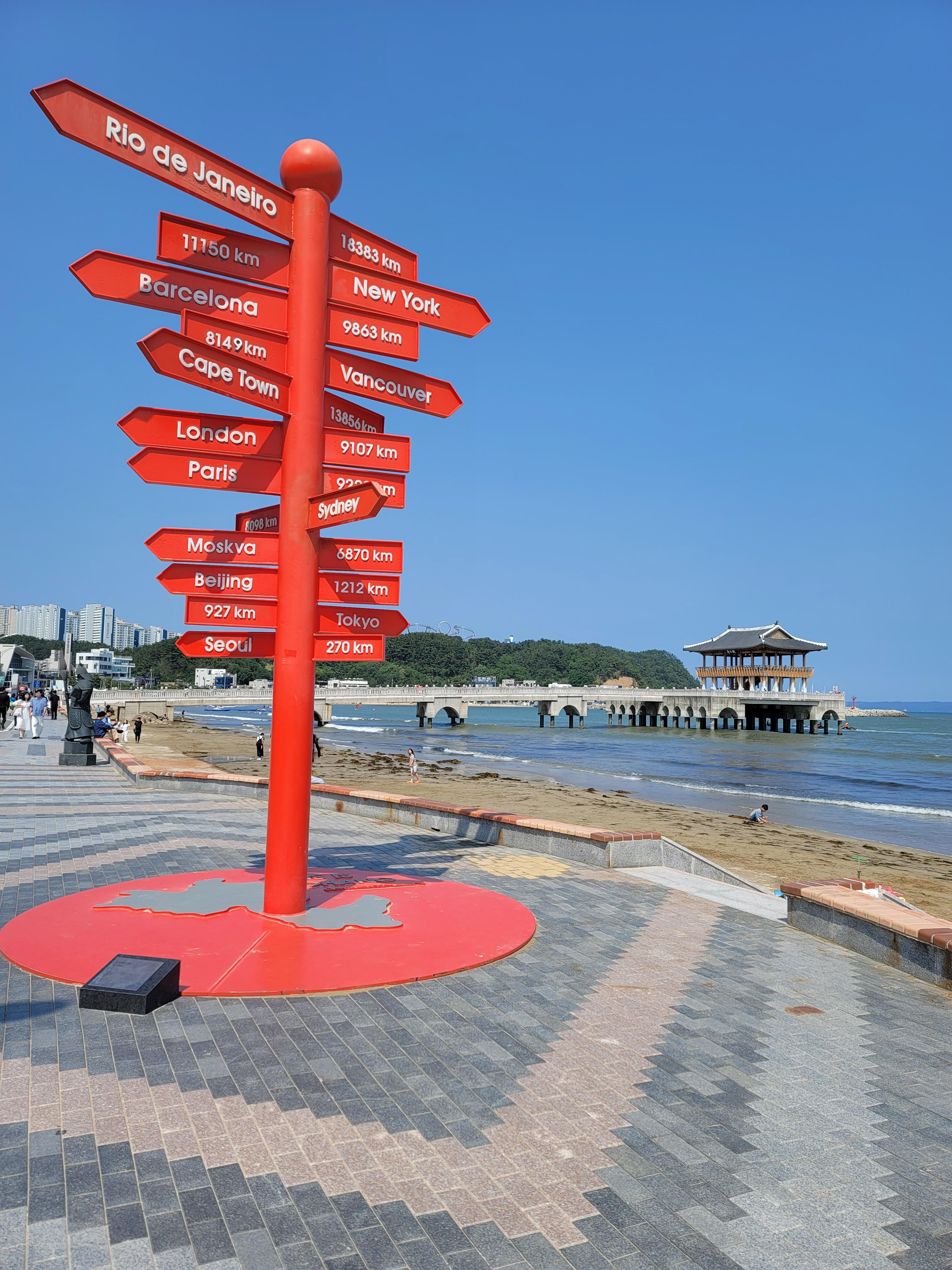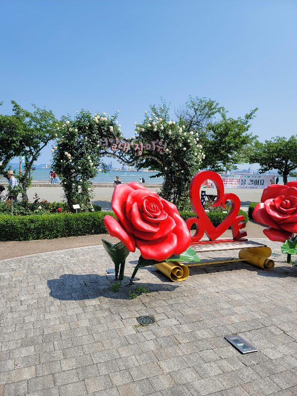 포항의 멋진 바다를 배경으로 한 포토존으로 연인들이 산책하기 좋은 곳입니다. 바다와 장미꽃이 어우러지는 풍경을 담을 수 있는 이 포토존은 포항을 방문한 기념을 남기기에 완벽한 장소입니다.