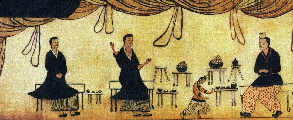 고구려 귀족과 스님으로 보이는 인물이 대화를 나누는 모습입니다. 당시 스님들은 치마를 입었다는 것과 귀족과 스님의 모습은 크게 그렸고, 시종은 작게 그린 것으로 보아 신분제 사회임을 알 수 있습니다.
