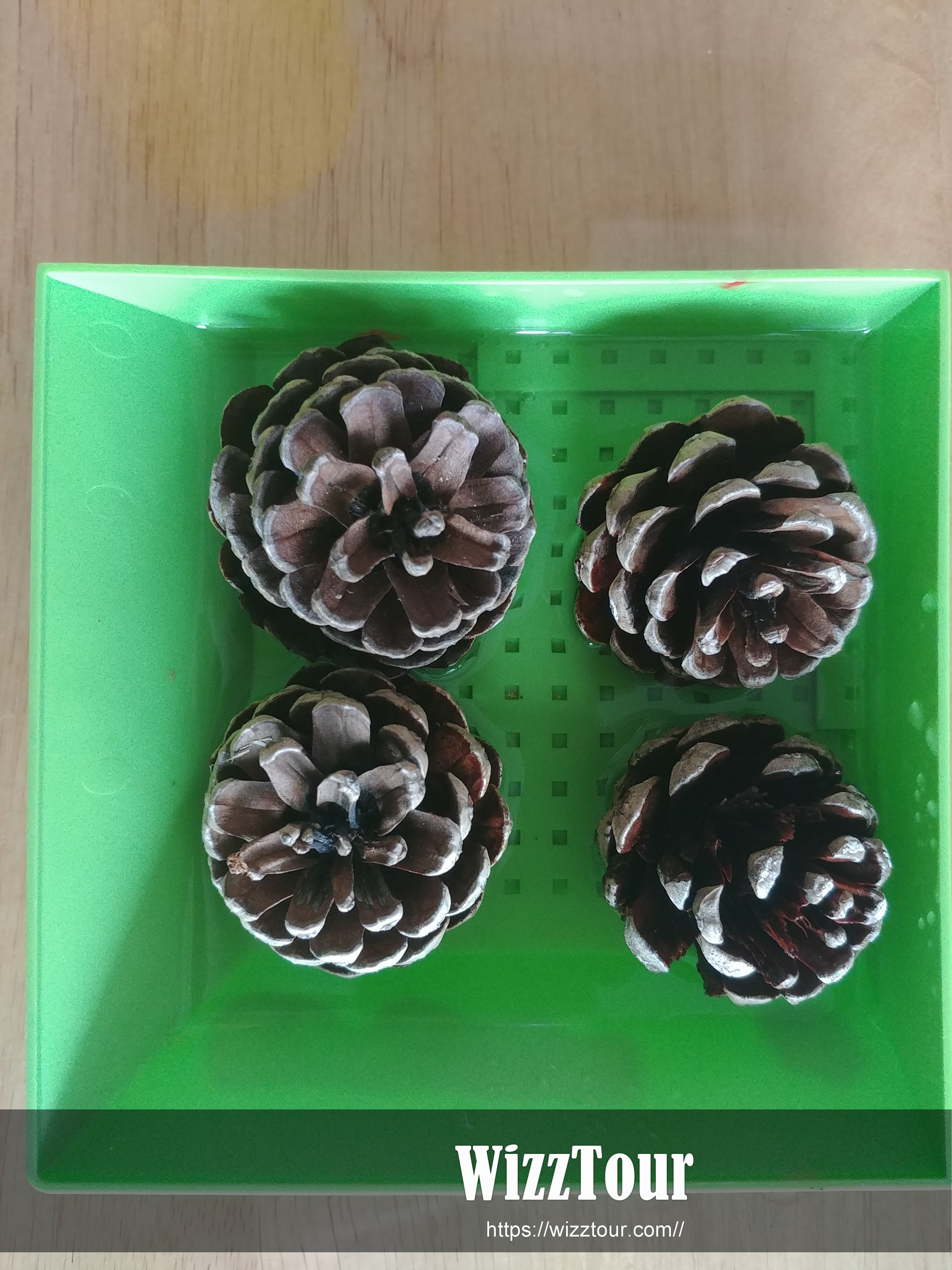 아이들에게 활짝 펼쳐 있는 솔방울만 줍도록 안내하고 검수해서 담아왔습니다. 씻다 보면 위의 사진처럼 물을 머금고 조개처럼 잎이 닫혀 버렸습니다. 반대로 저렇게 닫혀 있는 솔방울을 주워오면 안쪽을 씻을 수 없답니다.
