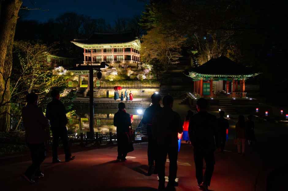 1. 야간기행 - 해설사의 이야기를 통해 창덕궁의 역사·문화·조경을 자연스럽게 체험할 수 있는 야간 기행 2. 각 장소별 특화된 전통예술공연 진행(상량정, 연경당) 3. 안내해설 - 달빛기행을 위해 특화된 안내해설 제공 4. 관람동선 - 금호문 → 진선문 → 인정전 → 희정당 → 낙선재 → 상량정 → 부용지→ 애련정과 애련지 → 연경당 → 후원 숲길 → 금호문 - 입장료 유료 - 참가비 : 1인 30,000원 * 장애인 50% 할인: 중증(구 1~3급) 본인포함 2인, 경증(구 4~6급) 본인 한정 * 국가유공자 및 국가보훈등록증 소지자 본인 한정 50% 할인